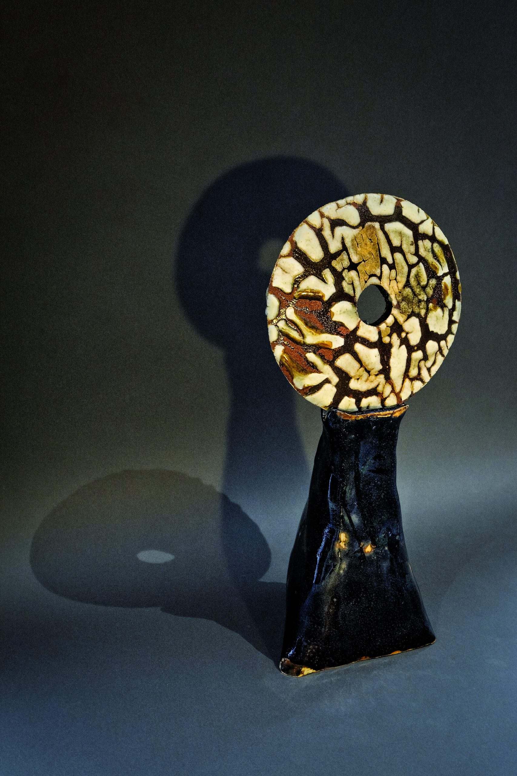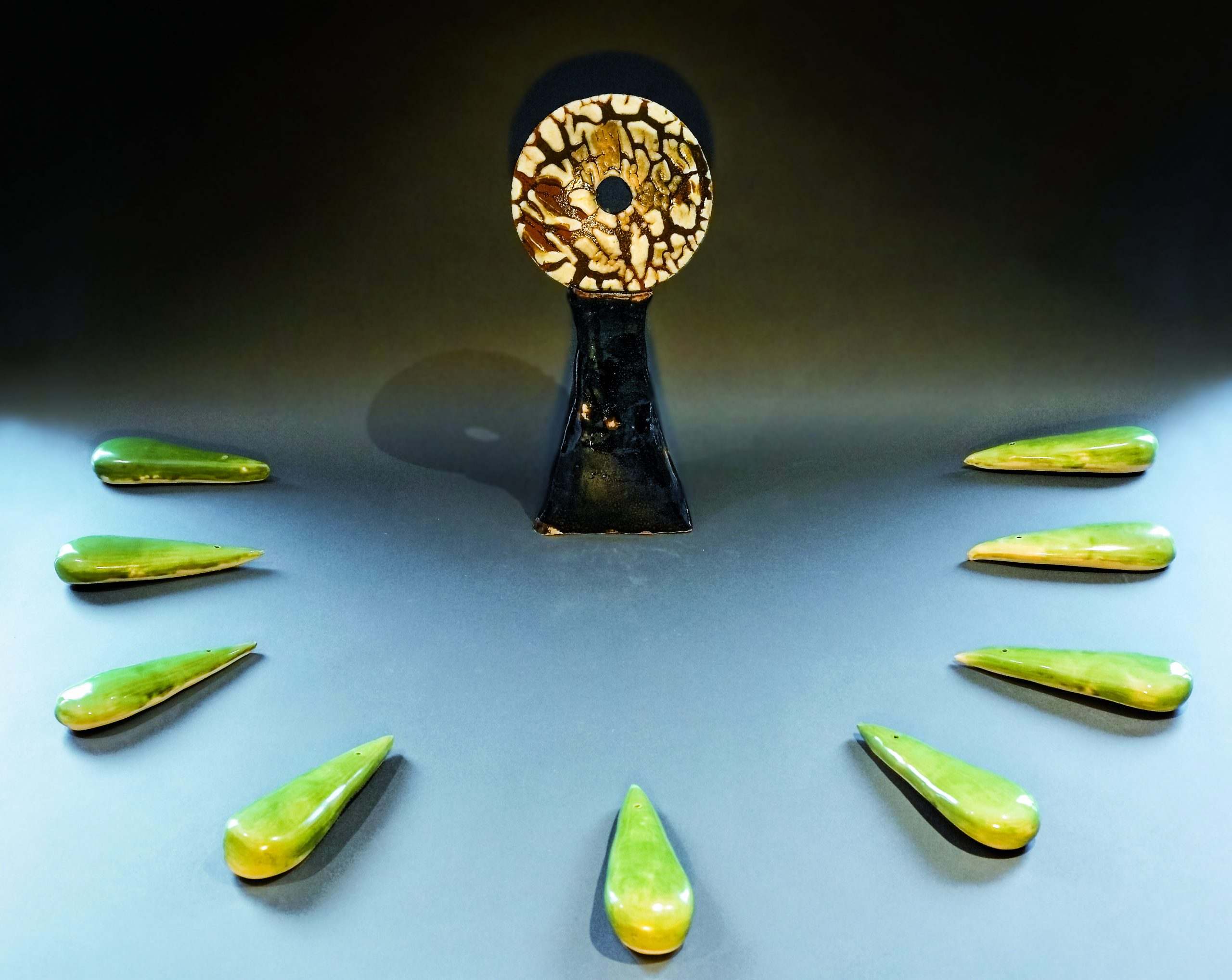 Soif d’histoire, je me tourne naturellement dans mes créations céramiques vers le néolithique qui m’entoure et tout particulièrement avec les découvertes du Mané Er Hroëk et ses disques et haches percées en jadéite que l’on peut voir au musée de Carnac.