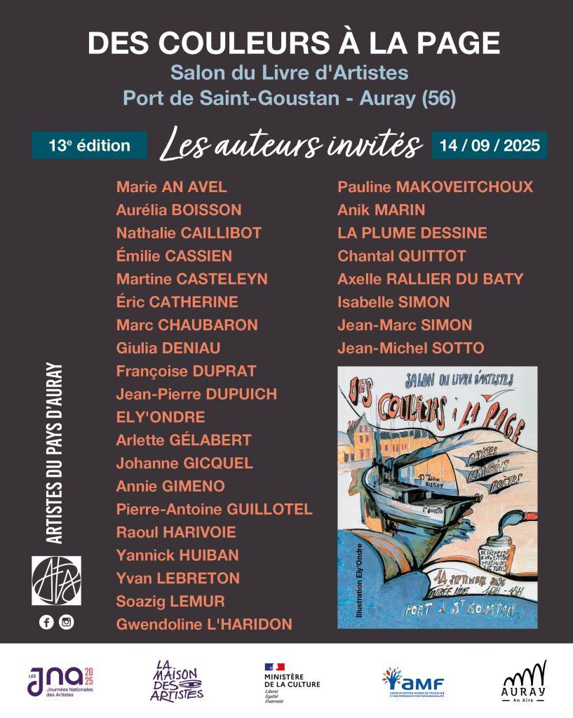 Les auteurs et artistes présents : Marie AN AVEL, Aurélia BOISSON, Nathalie CAILLIBOT, Émilie CASSIEN, Martine CASTELEYN, Éric CATHERINE, Marc CHAUBARON, Giulia DENIAU, Françoise DUPRAT, Jean-Pierre DUPUICH, ELY’ONDRE, Arlette GÉLABERT, Johanne GICQUEL, Annie GIMENO, Pierre-Antoine GUILLOTEL, Raoul HARIVOIE, Yannick HUIBAN, Yvan LEBRETON, Soazig LEMUR, Gwendoline L’HARIDON, Pauline MAKOVEITCHOUX, Anik MARIN, LA PLUME DESSINE, Chantal QUITTOT, Axelle RALLIER DU BATY, Isabelle SIMON, Jean-Marc SIMON, Jean-Michel SOTTO.