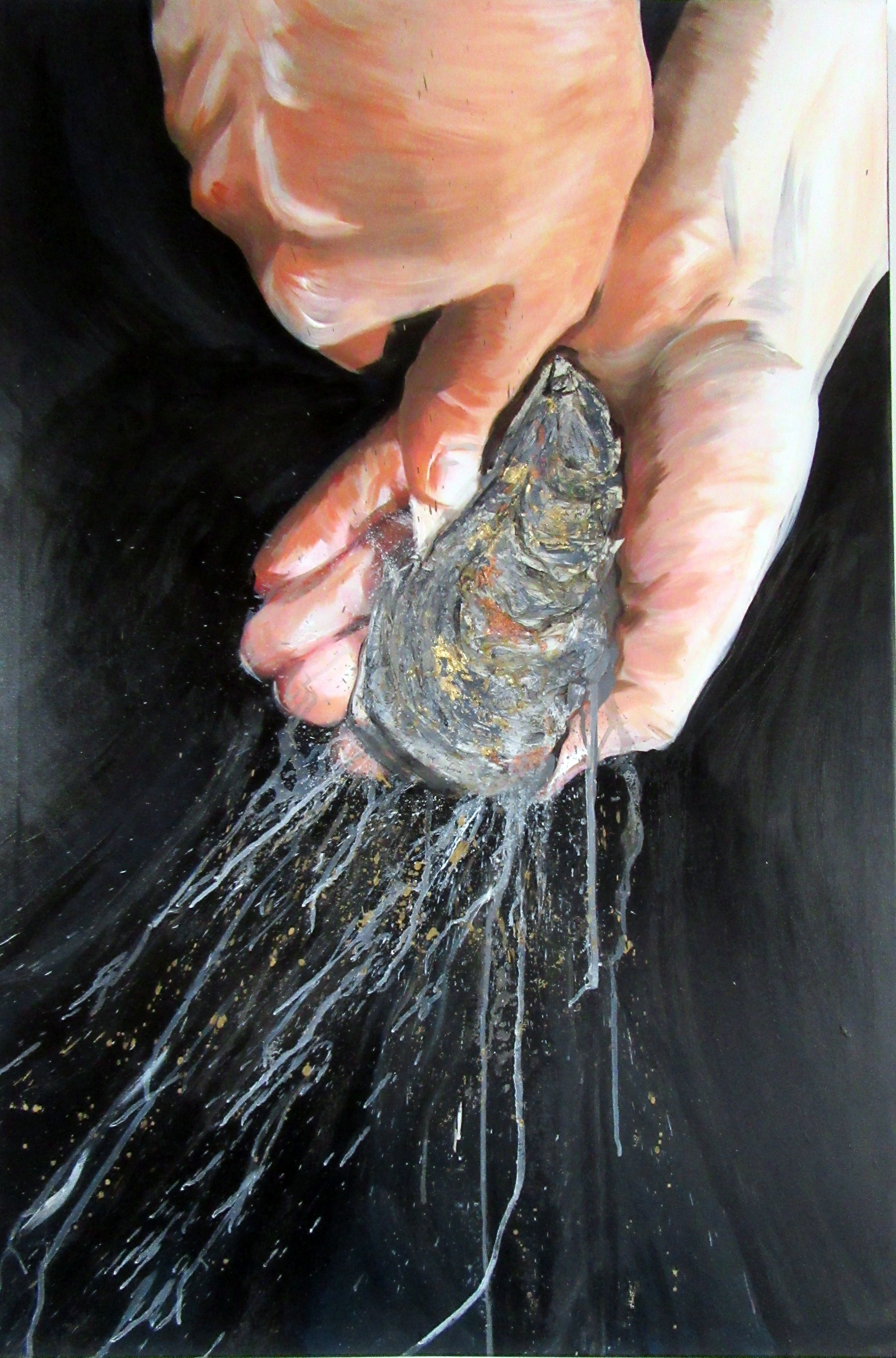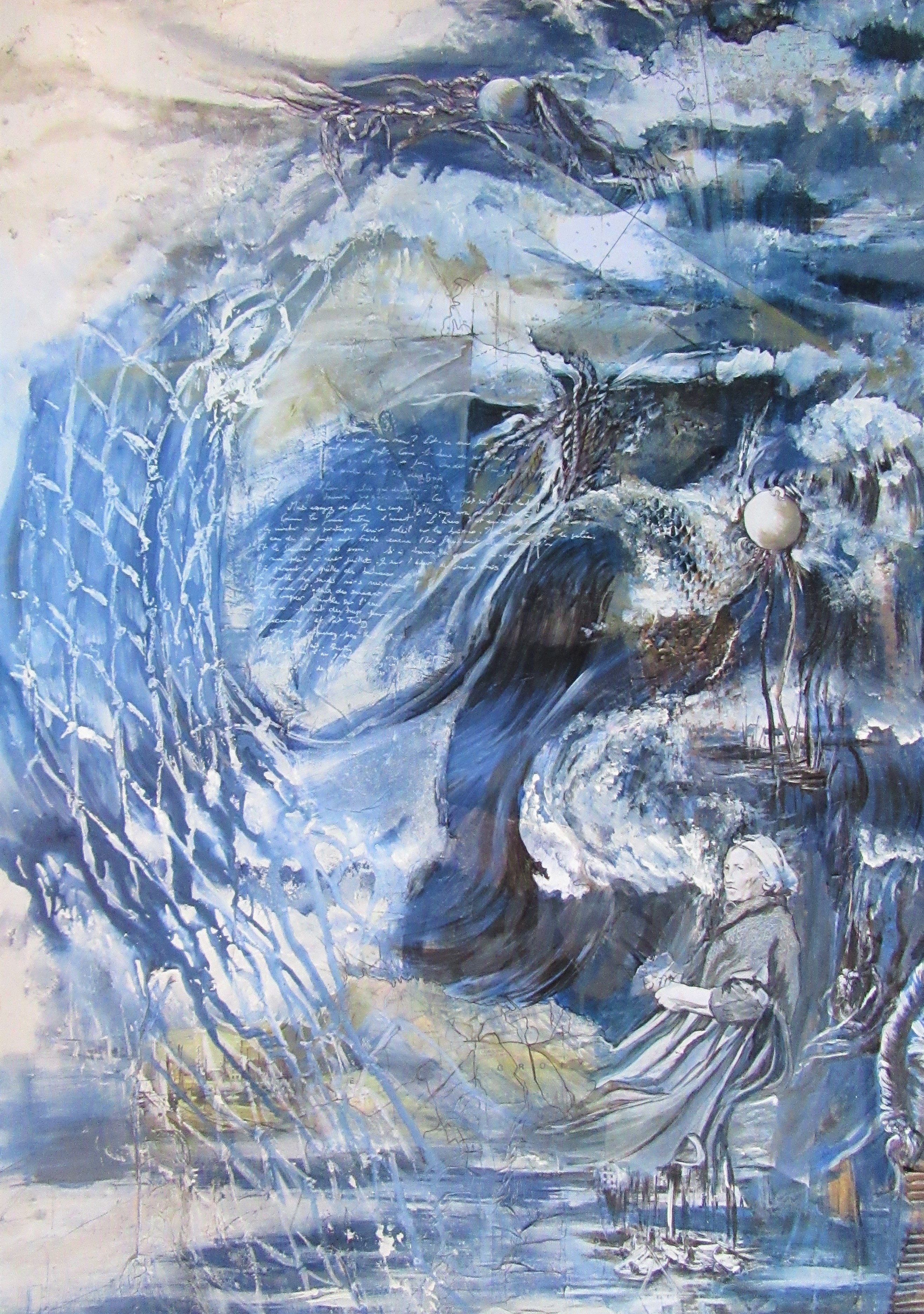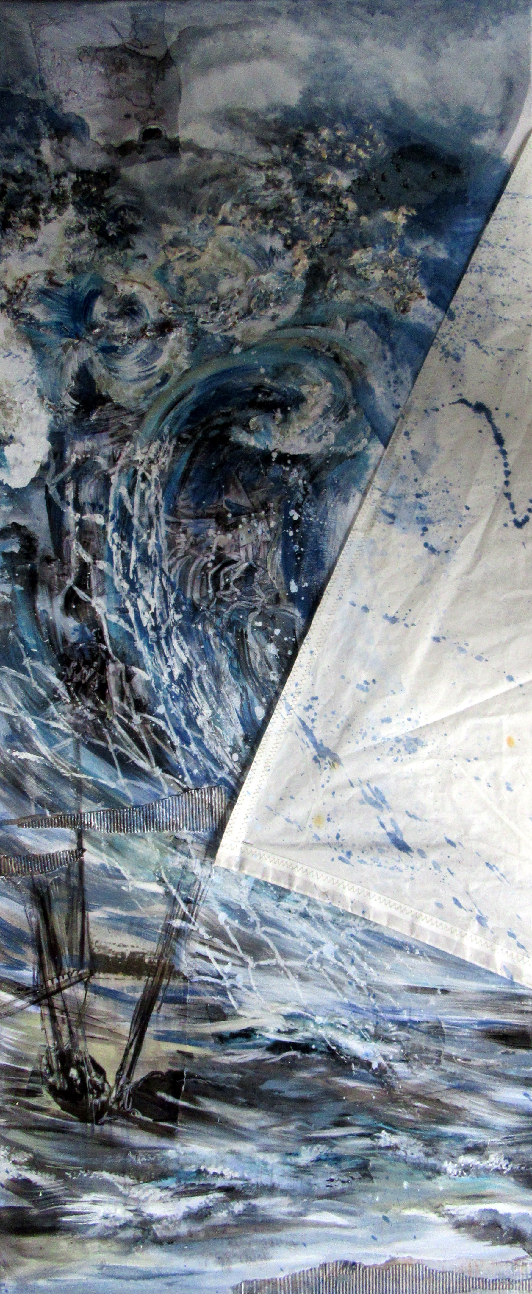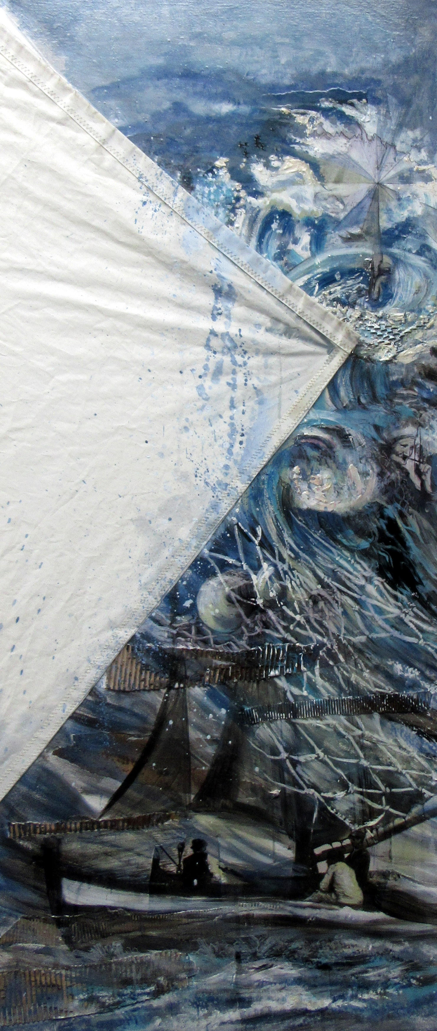 Vagues, filets, amarres ou voiles de bateau, j’évoque l’univers marin au travers d’œuvres en technique mixte. Elles fonctionnent par strates incluant différents matériaux comme des morceaux de journaux ou d’anciennes cartes postales à la peinture pour incarner cette « mémoire de paysage ». Les images se supersent créant des rapprochements poétiques.